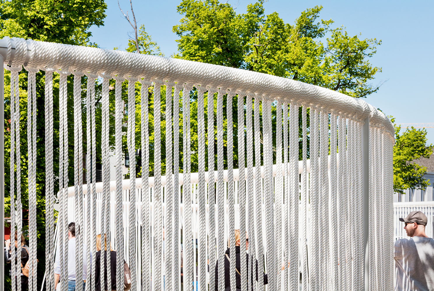 Pavilion có cấu tạo đơn giản: bao gồm phao đặt dưới tấm boong giúp pavilion nổi trên mặt nước,khung sắt , cột sắt,thanh ray bằng sắt nối các cột sắt,và rèm bằng dây thừng được quấn trực tiếp trên các thanh ray.Việc sử dụng rèm bằng dây thừng và bóng của chúng tạo ra những khoảng trống mơ hồ, khi phản ứng với ánh sáng,và gió tạo ra không gian đóng mở liên tục,làm mờ đi các ranh giới cứng nhắc,và làm cho cảnh quan từ trở nên quen thuộc trở nên tươi vui hơn.