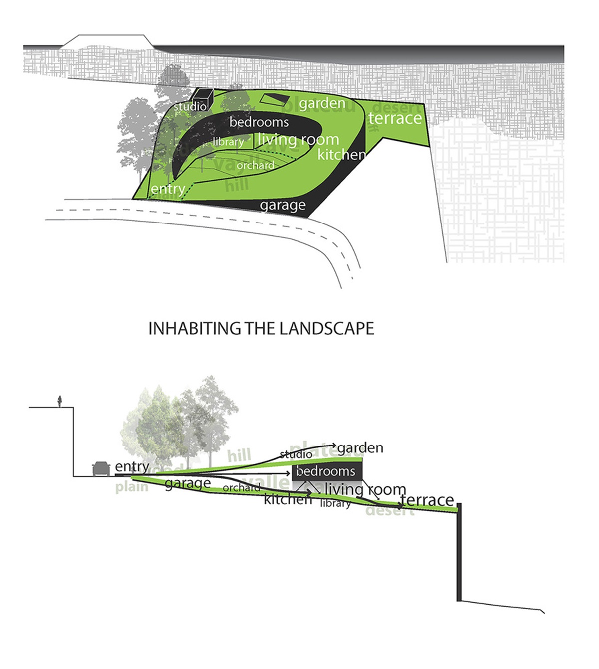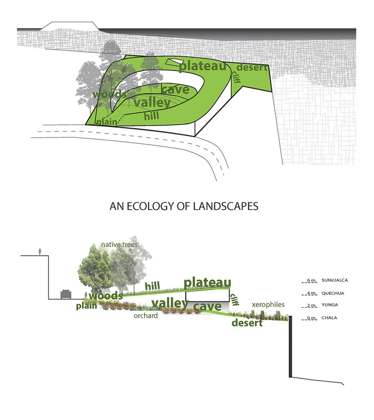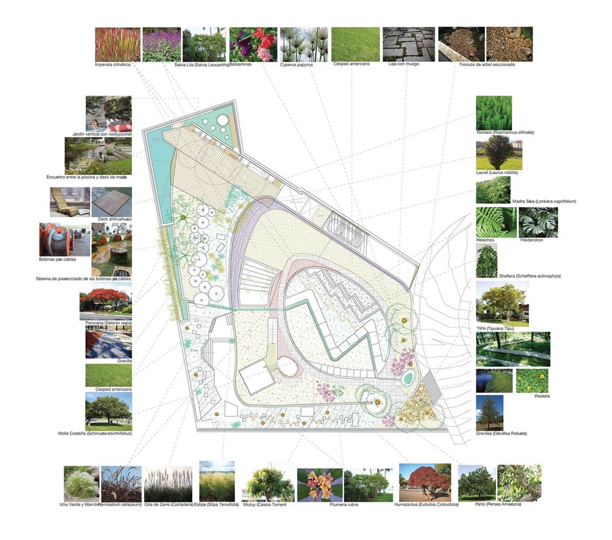 Các kiến trúc sư đã khéo léo phân tầng không gian để tạo ra một ngọn đồi, thung lũng, một vách đá, hang động, khe núi. Trong đó, mỗi vị trí địa điểm sẽ tương ứng với một lớp thảm thực vật nhất định như cây cỏ, rau, hoa xương rồng hay hoa sen…