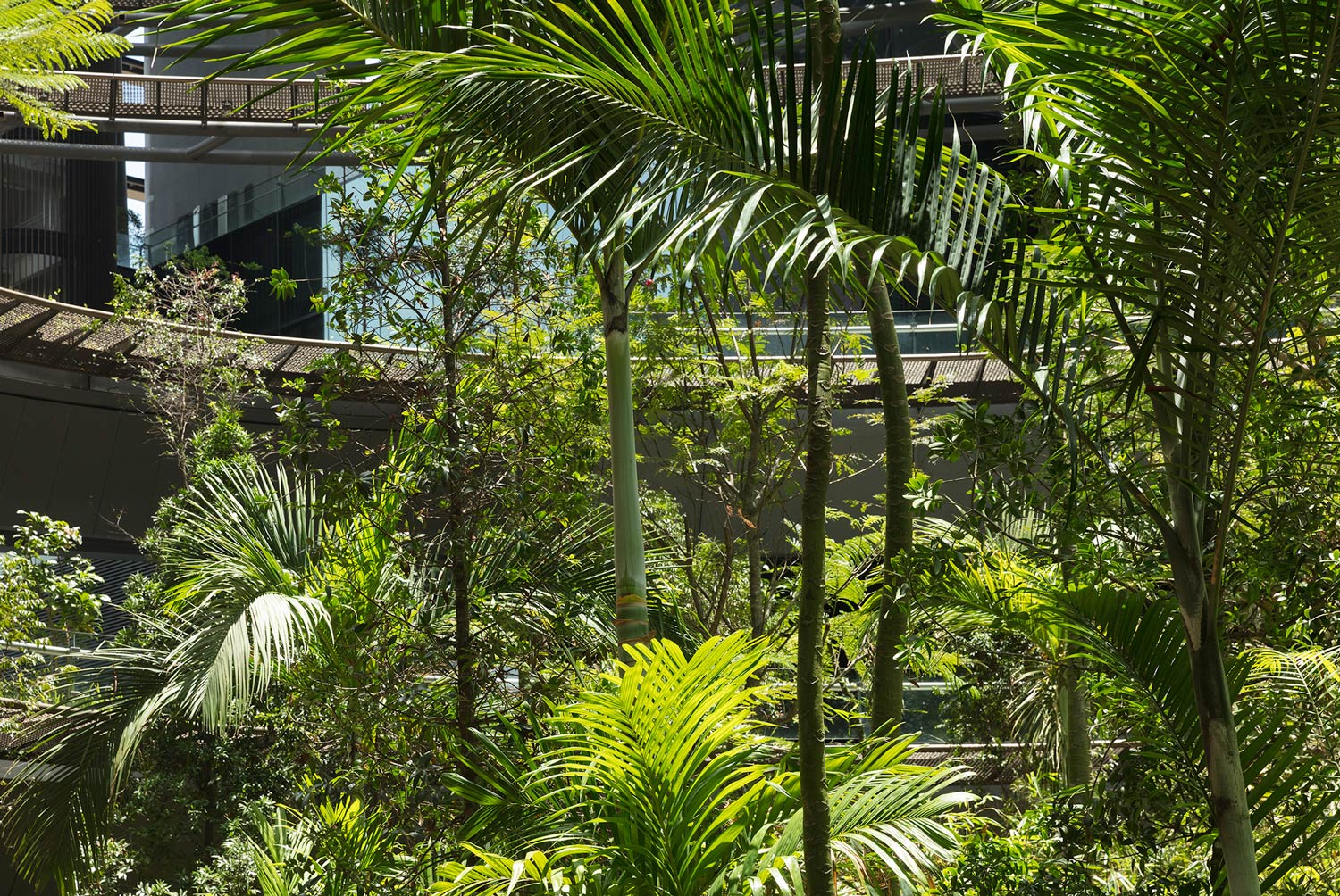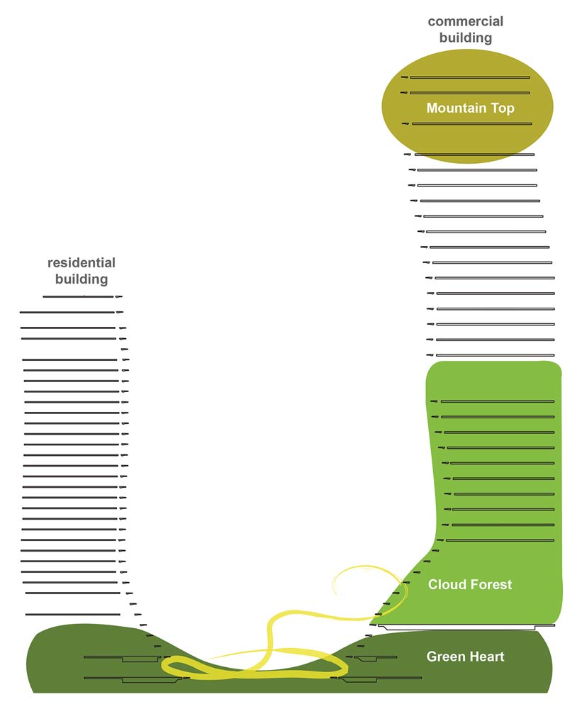 Được coi là một trong những khu vực công trình có cảnh quan rộng lớn nhất ở Vịnh Marina, Green Heart tạo ra một không gian công cộng đầy cảm hứng và đa chức năng. Khách thăm quan có thể vào thăm khu vườn trung tâm từ bốn lối vào ở tầng trệt. Một bể cảnh lớn dùng phản chiếu lớn phản ánh bầu trời và một thác nước ba tầng tạo trên mặt đứng công trình. Vườn được kết nối bằng những con đường giao nhau, trong khi đó 240 cây bóng mát lớn được trồng bên dưới những tấm kính lợp bóng láng của tòa nhà kéo dài đến quảng trường trung tâm. Một đoạn đường dốc chạy quanh co và kết nối các tầng của tòa nhà. Những dòng nước và ánh sáng rơi từ trên xuống và tiếng động khi nước rơi xuống bể tạo nên cảm giác vô cùng thú vị. Du khách và cư dân có thể tận hưởng cảm giác giống như vượt lên trời phía trên thảm thực vật nhiệt đới, trải nghiệm những thay đổi về khí hậu ở các mức độ khác nhau, giống như trong thung lũng rừng nhiệt đới: Từ Trái tim Xanh, qua Cloud Garden, lên đỉnh núi.